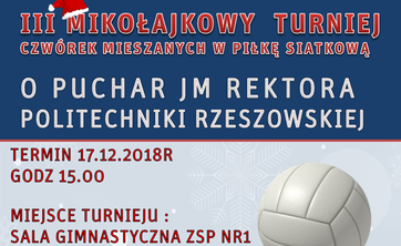 III Mikołajkowy Turniej Czwórek Mieszanych w Piłkę Siatkową o Puchar JM Rektora Politechniki Rzeszowskiej. Turniej odbędzie się w poniedziałek 17 grudnia 2018 r. o godz. 15:00.