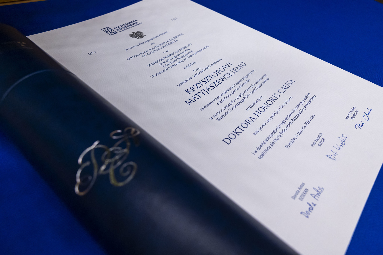 Godność doktora honoris causa jest najwyższym wyróżnieniem, jakie uczelnia może nadać osobom zasłużonym w obszarze nauki, kultury czy życia społecznego, które swoją postawą i dokonaniami wyznaczają standardy przyszłym pokoleniom. Jest to wyjątkowe wydarzenie dla środowiska akademickiego. Tytuł ten Politechnika Rzeszowska przyznaje od 2002 r., a do tej pory uhonorowano nim 15 osób. Od początków istnienia ludzkość ciągle poszukuje, tworzy, dąży do zmian na lepsze. Na tym polega postęp, który napędzają wybitne jednostki, ludzie nauki, twórcy, badacze, wielkie i nieprzeciętne umysły. To właśnie dzięki takim osobom kolejne pokolenia zawdzięczają rozwój, poprawę poziomu życia, spokój i bezpieczeństwo. „Jestem zaszczycony, że jako rektor Politechniki Rzeszowskiej w imieniu społeczności akademickiej uczelni mogę uhonorować znakomitego uczonego o bogatym dorobku naukowym, specjalizującego się w dziedzinie chemii polimerów Pana Profesora Krzysztofa Matyjaszewskiego. Tytuł doktora honoris causa Politechniki Rzeszowskiej został nadany wybitnemu naukowcowi, którego zasługi dla świata nauki i w obszarze kształcenia kadry naukowej są niepodważalne. Przyznając tę godność prof. Krzysztofowi Matyjaszewskiemu, nagradzamy wybitną osobowość i wielki autorytet naukowy, który wywarł pozytywne oddziaływanie również na naszą społeczność akademicką. Politechnika Rzeszowska jest zaszczycona, że może korzystać z wiedzy, doświadczenia i życzliwości Profesora, z którym od wielu lat współpracują pracownicy Wydziału Chemicznego” – mówił rektor prof. dr hab. inż. Piotr Koszelnik.