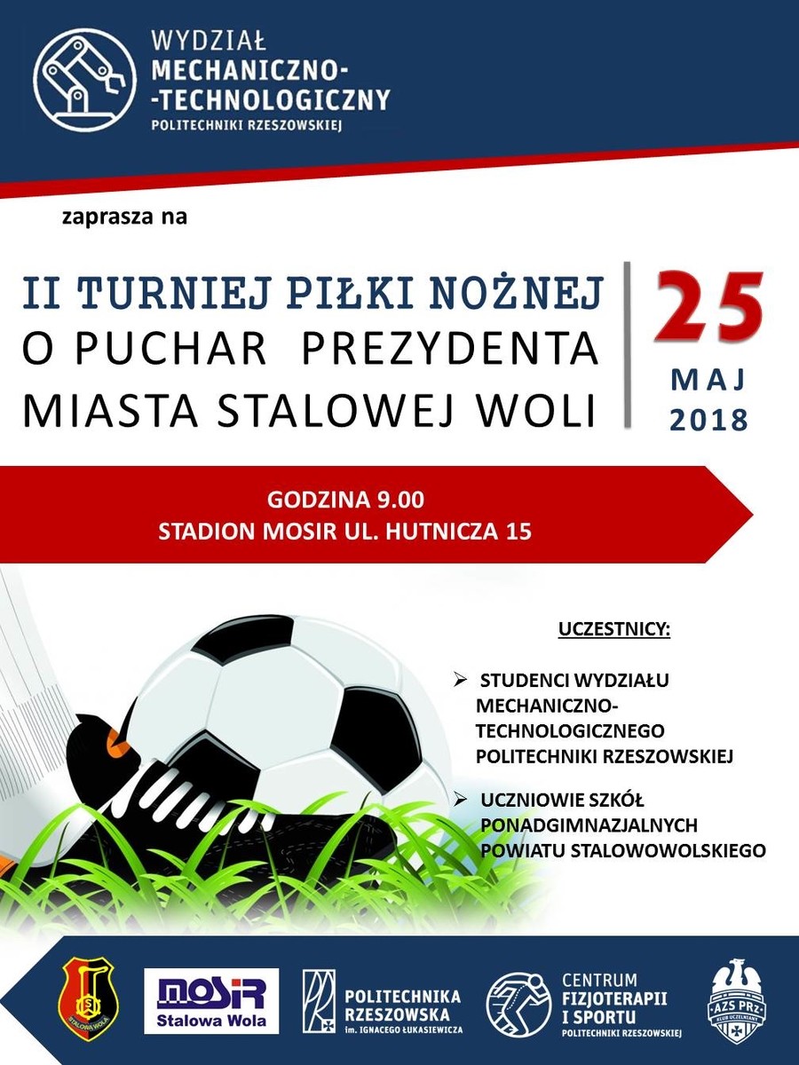 Wydział Mechaniczno-Technologiczny Politechniki Rzeszowskiej w Stalowej Woli zaprasza na II Turniej Piłki Nożnej o Puchar Prezydenta Miasta Stalowej Woli. W wydarzeniu weźmie udział drużyna reprezentująca WMT. Występ podczas rozgrywek ma na celu promocję Politechniki Rzeszowskiej w Stalowej Woli wśród uczniów szkół ponadgimnazjalnych.