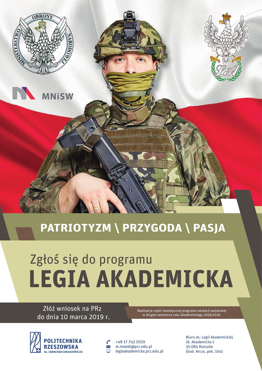 Do 10 marca br. Politechnika Rzeszowska przedłuża nabór dla studentów wszystkich uczelni chętnych do wstąpienia w szeregi Legii Akademickiej. Do tej pory zapisało się ponad 100 osób. Czekamy na kolejne zgłoszenia.